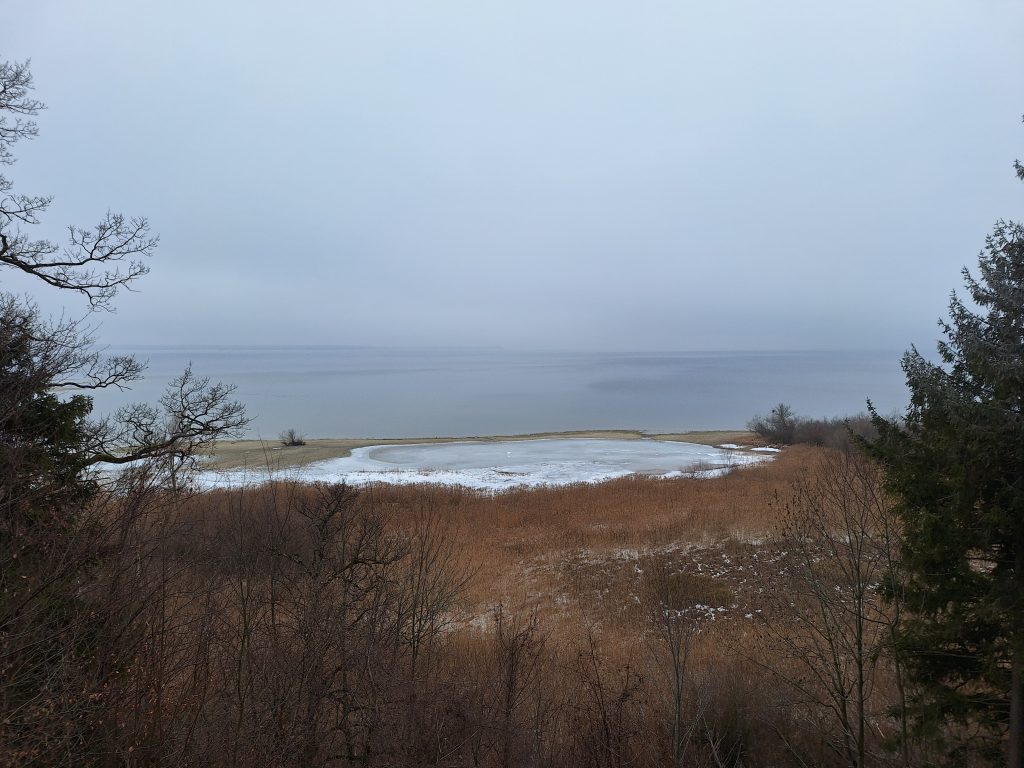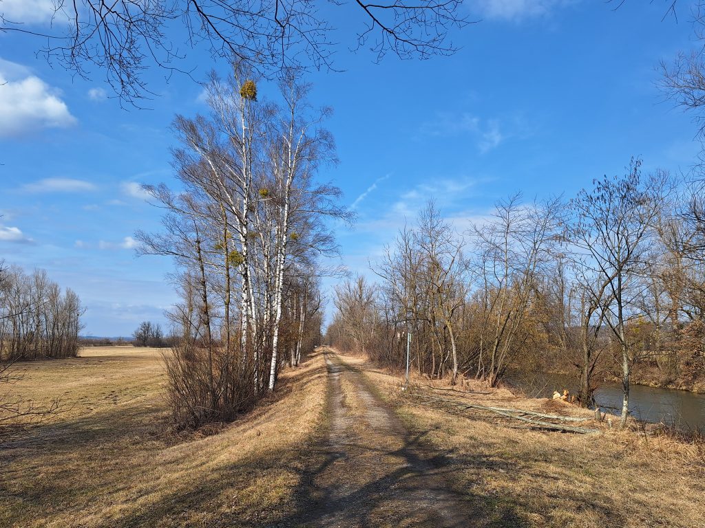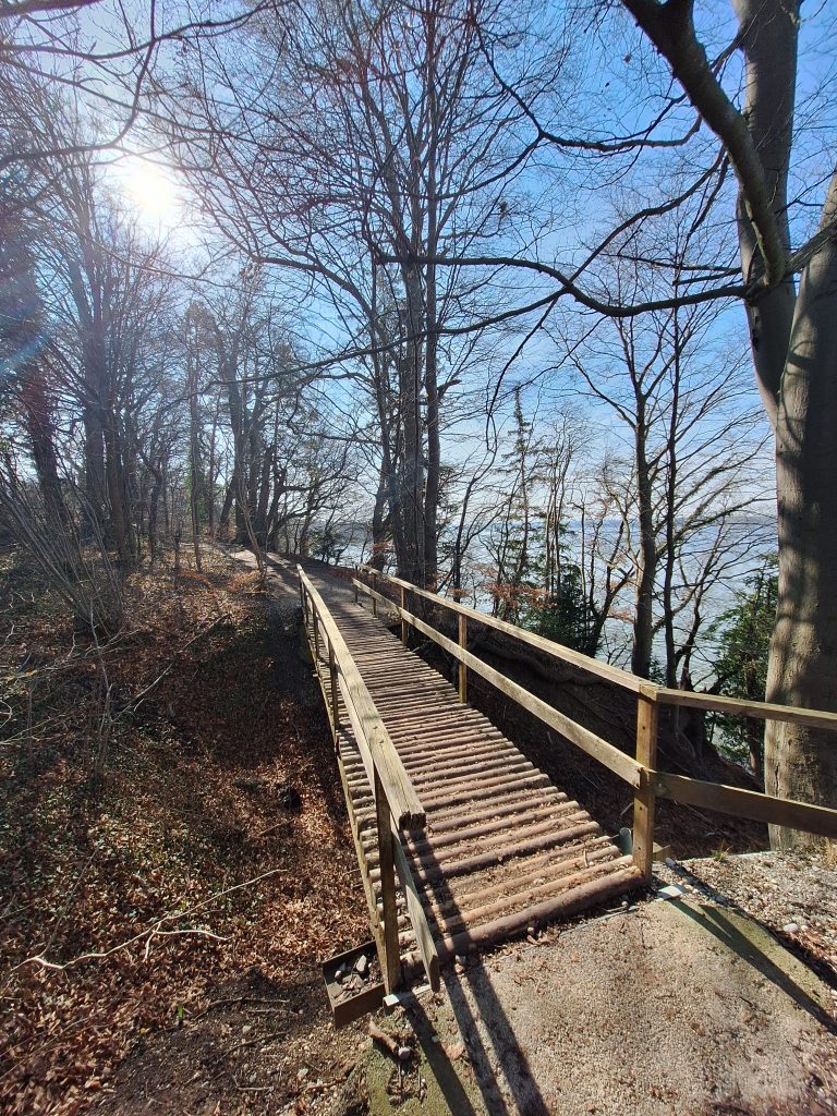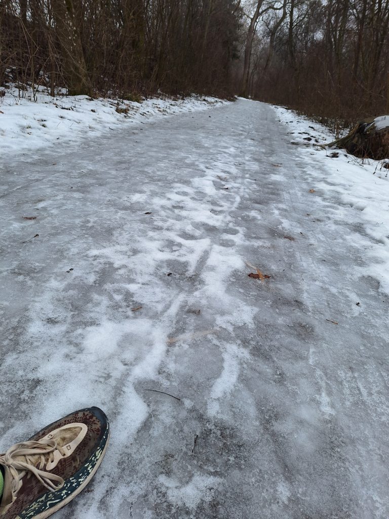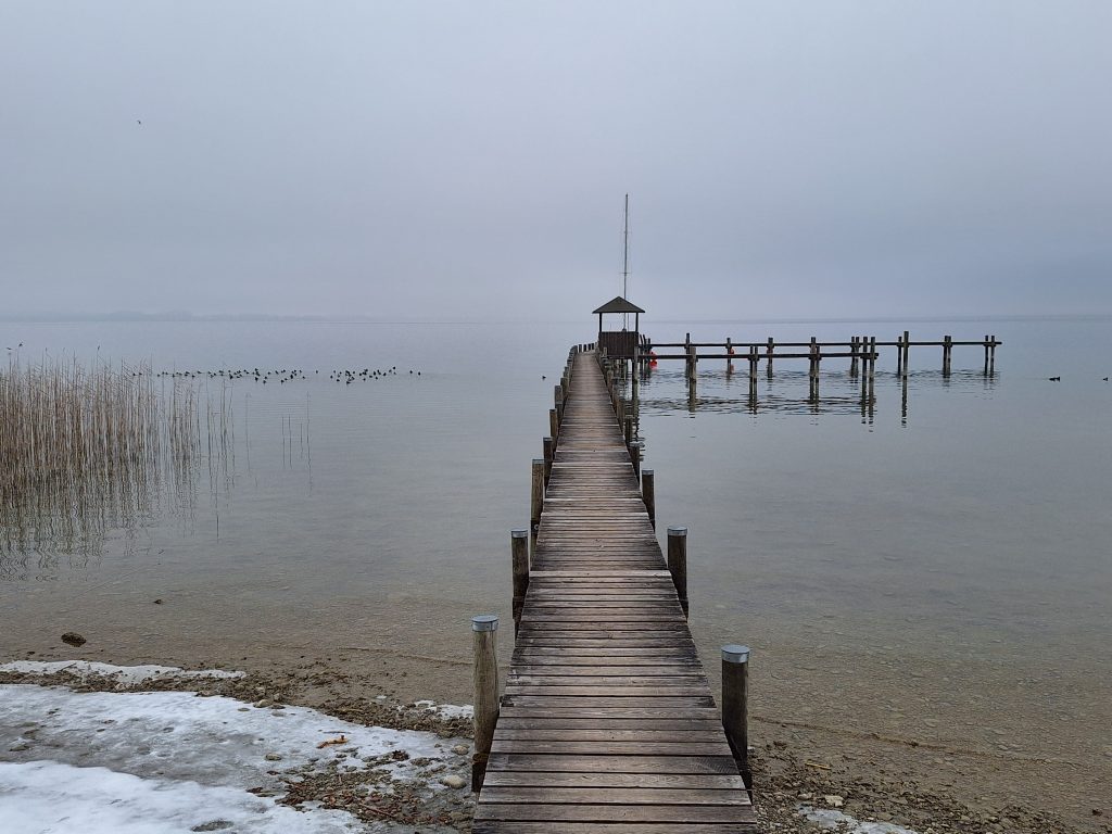 Dann endlich, ging es aufwärts mit unserer Beziehung. Ich bekam eine bessere Aussicht und auch die Wander- bzw. Feldwege führten durch mehr Natur. Das ständige Auf-das-Handy-schauen wurde seltener, da sich die Wege weniger verzweigten. Doch genau diese hatten es in sich. Durch die Schneemengen der letzten Wochen glich der Weg eher einer Eislaufbahn. Sobald die Schuhsohlen nicht senkrecht auf dem Boden auftrafen oder sich abstießen herrschte große Rutschgefahr. Naja, so blieb man wenigstens im gemaßregelten Grundausdauer-Tempo. Manchmal sah man aber auch die eingefrorenen Fußabdrücke der Fußgänger. Was einerseits prima war, da man dann Profil hatte und sich abdrücken konnte, aber andrerseits sehr gut aufpassen musste um nicht umzuknicken. Trotzdem, dieser Teil machte wirklich am meisten Spaß. Bei Seebruck war es dann mit der Idylle vorbei und der Weg führte teilweise an Land- und Schnellstraßen vorbei. Allerdings gab es sehr einladende Cafés zu sehen, die jedoch – wer hätte es gedacht – so gut wie alle geschlossen hatten. Nach 25 km kam ich aber an eine schöne Anlegestelle, bei der man so ziemlich für sich war und genoss meine Pausenbreze. Wegen der Temperaturen blieb die Rest allerdings recht kurz.