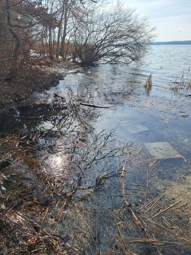Ich habe mich für den „Achter“ entschieden, also den kleinen Brombachsee mitzunehmen und dann ein zweites Mal über die Staumauer zurückzukommen. Der „Kleine“ hat einen anderen Charakter. Hier gibt es keine Sandstrände mehr, sondern einfach Gras. Bayrisch halt. An manchen Stellen durchläuft man auch Campinganlagen, die jedoch nicht wirklich störend sind. Trotzdem fiel mir eine nette Hinterlassenschaft auf, die mich an eine Redewendung erinnerte. „Den Ast auf dem man sitzt absägen.“ Für mich ist das nun eine sommerliche Redewendung. Das Bild, welches sich mir dargeboten hat, war wohl die winterliche Variante dieser Redewendung: „Um das Eis, welches einen trägt, pinkeln.“