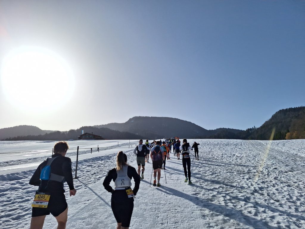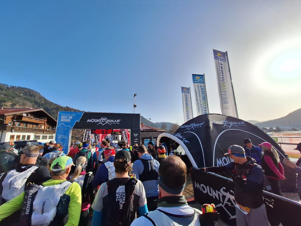 Nach dem dritten Anlauf hat es endlich geklappt. Ich durfte ein Mountainman werden. Im ersten Anlauf musste ich fiebrig im Bett den Anderen den Spaß lassen und bei Versuch zwei musste der Veranstalter das Rennen kurzfristig absagen (es beschwerten sich zu viele Anwohner). Doch zurück zum Rennen. Hinter dem Mountainman steht eine ganze Serie an Trailläufen, die allesamt durch die Berge führen. Ca. sechs Mal im Jahr hat man rund um die Alpenländer die Möglichkeit ein Rennen zu genießen. Bei mir war es der Wintertrail in Reit im Winkl. Die Größe dieser „Marke“ merkt man schon am Merchandise, der außerordentlich guten Streckenmarkierung und dem Ambiente im Start- bzw Finisherbereich. Letzter befindet sich direkt hinter dem Festsaal des Ortes. Manch einer, so auch ich, würde sagen: „Krass, die haben den ganzen Festsaal, also die Stadthalle, von der Stadt bekommen.“ Der Saal ist aber größentechnisch eher das Bierlokal für den ansässigen Fußballverein. Dennoch hat es einen gewissen Charme und passt total in die Alpenwelt hinein. Direkt am dahinterliegenden Fußballplatz war der Startbereich für alle Distanzen. Da die Wegstrecke die meiste Zeit jedoch sehr schmal ist, starten die Distanzen zeitversetzt. Und schon am Start darf man dann das erste Detail genießen (bzgl Genuss hat der Mountainman viel zu bieten): Man startet auf einer Langlaufstrecke. Endlich mal wieder ein neues Terrain. Ein großer Teil des Rennens hatte diese Langlaufstrecke als Untergrund. Der Moderator heizte uns mit Musik und Sprüchen noch etwas ein und die Motivation befand sich auf dem Höchststand. 3… 2… 1… los!