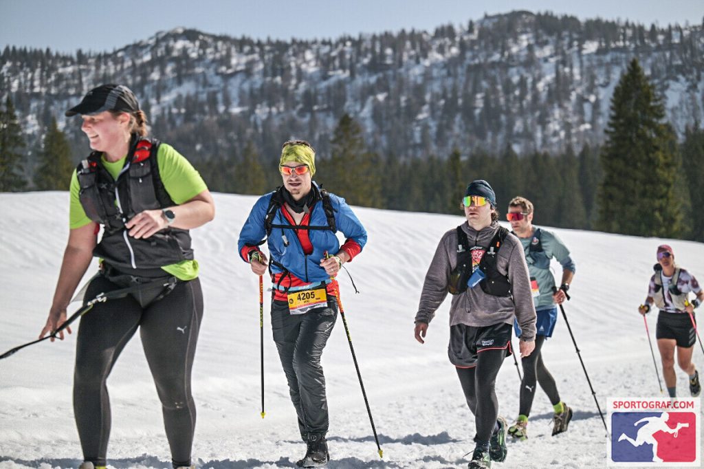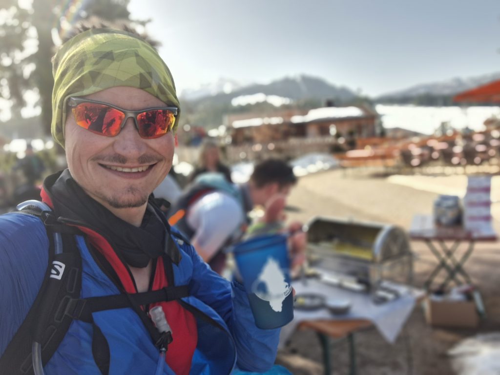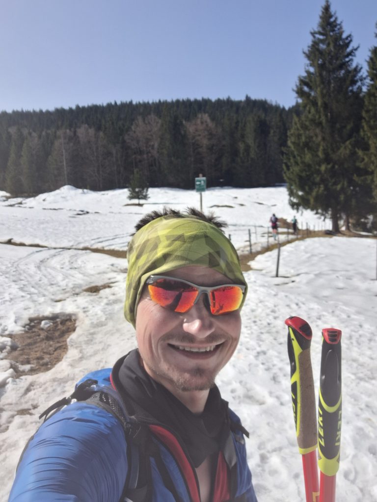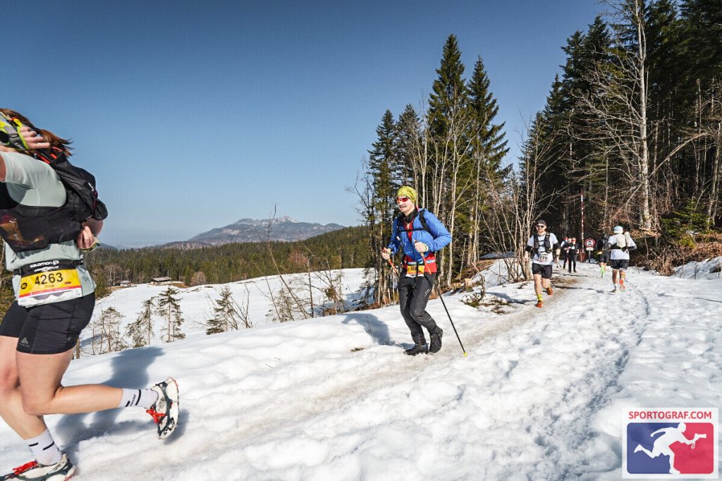 Vor dem Rennen musste man einen Sicherheitscheck durchlaufen. Jeder Läufer benötigte ein Erste-Hilfe-Set, genug zum Trinken, einen Tracker und noch vieles mehr. Ein Laufrucksack war also unumgänglich. Bei Trailläufen ist das ganz normal. Wie gesagt ist die Strecke jedoch umwerfend gut ausgeschildert und auch an der Verpflegung mangelte es nicht. Dennoch gab es Tücken. Anfang März… Winter! …Möchte man meinen. Das Wetter war allerdings bombastisch. Sonnenschein und zweistellige Plusgrade. Man hatte Bock zum Laufen! Wie zieht man sich aber nun für einen Trail-Marathon (ja, ich habe die XL-Variante gewählt) im Schnee bei Frühlingstemperaturen am besten an? Zu kalt: Der Körper braucht mehr Energie zum heizen und zum Schluss erkältet man sich. Zu warm: Man schwitzt zu viel und verliert zu viel Flüssigkeit und Elektrolyte. Wie meistens war ich eher in der zweiten Kategorie zu finden. Die eigentliche Materialschlacht fand allerdings beim Schuhwerk statt. Bei ca 1600 Höhenmeter lohnen sich Überlegungen zu diesem Thema. Berg, Schnee, Eis, Trail. Welches Profil verwendet man? Legt man sich gleich die Grödeln (Schneeketten für Schuhe) an oder wartet man? Reicht der eigene Schuhbelag? Bzgl der Schuhwahl habe ich meinen Icebugs wieder das Vertrauen geschenkt. Diese Schuhe haben Spikes schon integriert, die sich je nach Untergrund von alleine ausfahren. Und wie auch bei den anderen Läufen in Grönland und Russland, haben sie mich nicht enttäuscht. Die Läufer, die sich für ihre normalen Trailschuhe entschieden haben, hatten z. T. große Schwierigkeiten nicht auszurutschen. Die Teilnehmer, die mehr mit der Kamera, als mit der Strecke beschäftigt waren, machten des Öfteren schöne Schlitterfiguren. An den Stellen, an denen die Strecke vereist war, legten die Trailschuhe Schrittgeschwindigkeit ein. Ging es bei der Strecke auch noch bergab, mussten die Läufer die unebenen Gräben am Streckenrand verwenden. Der Downhill-Bereich? Ohne Grödeln keine Chance. Hier war durchaus die Verletzungschance gegeben. Ich hatte jedoch Glück. Mit meinen Schuhen konnte ich im ersten Streckenteil wie auf Teer laufen. Vor allem der Downhill-Teil machte sehr viel Spaß, da ich blindlinks runterrennen konnte. In der zweiten Hälfte wurde die Strecke sehr viel sulziger. Dies fühlte sich dann teilweise so an, wie im Sand zu laufen. Die Icebugs griffen nicht mehr ganz so gut und auch die Trail-Stöcke stachen nun durch die Schneedecke durch. Bzgl Sicherheit und Tempo hatte ich trotzdem eine gute Wahl getroffen.