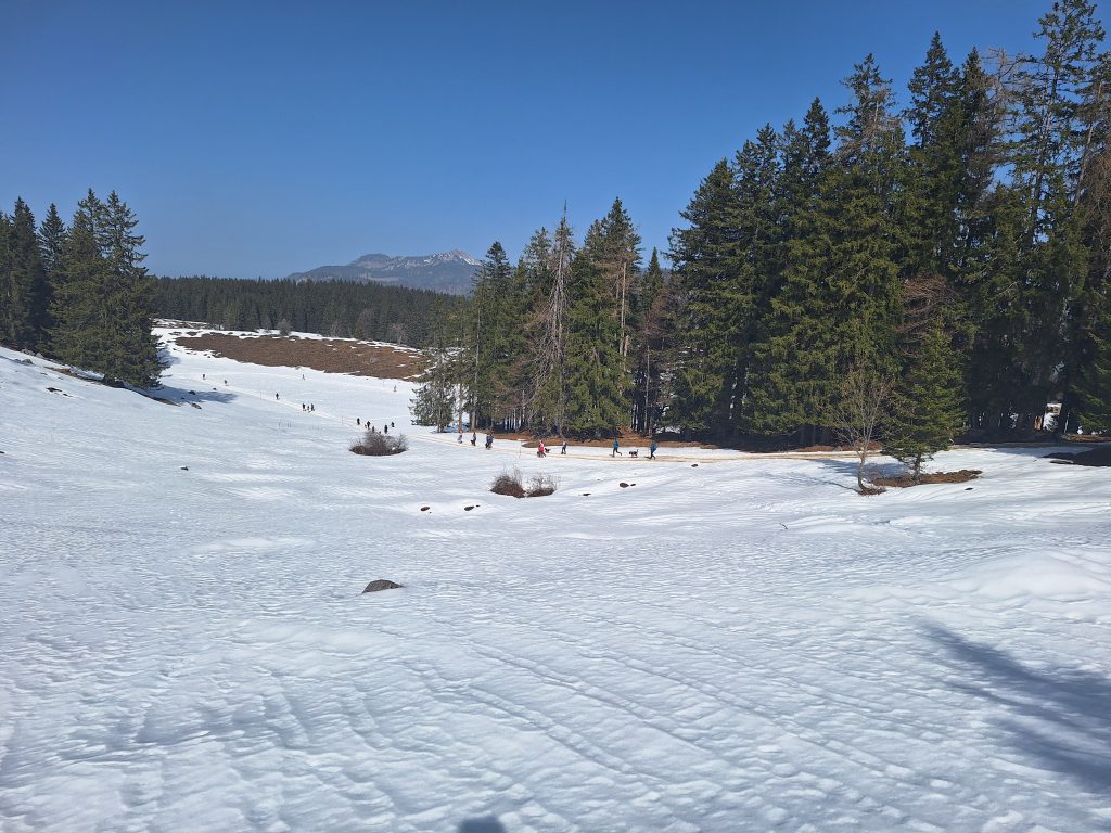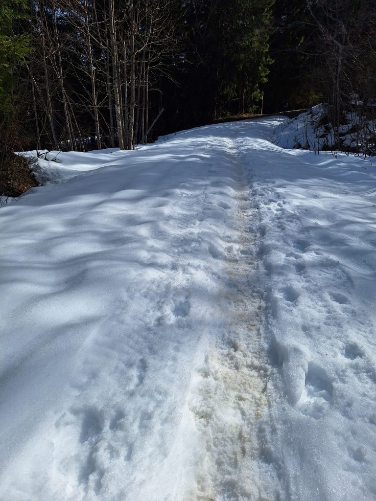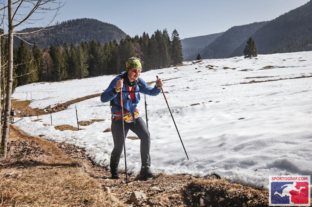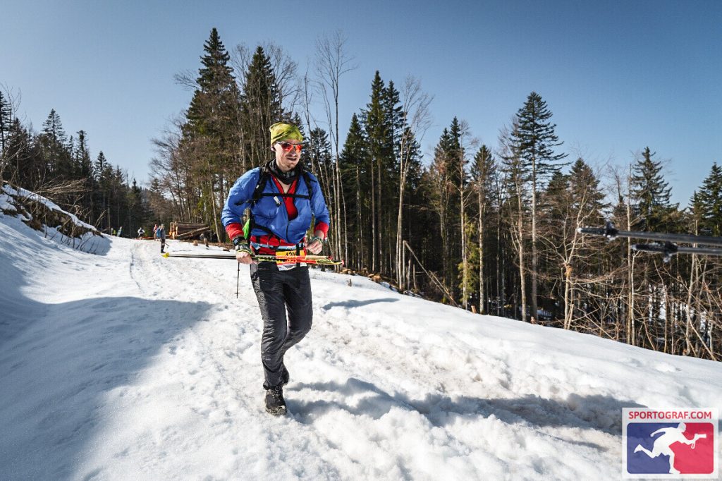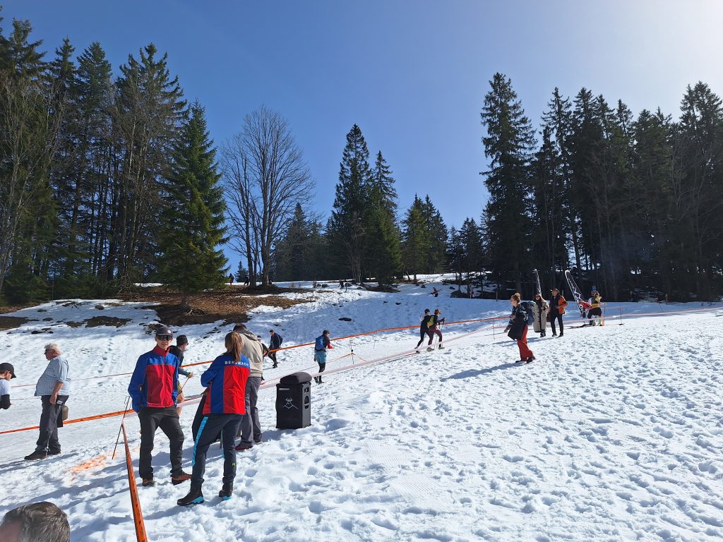 Vor dem Rennen musste man einen Sicherheitscheck durchlaufen. Jeder Läufer benötigte ein Erste-Hilfe-Set, genug zum Trinken, einen Tracker und noch vieles mehr. Ein Laufrucksack war also unumgänglich. Bei Trailläufen ist das ganz normal. Wie gesagt ist die Strecke jedoch umwerfend gut ausgeschildert und auch an der Verpflegung mangelte es nicht. Dennoch gab es Tücken. Anfang März… Winter! …Möchte man meinen. Das Wetter war allerdings bombastisch. Sonnenschein und zweistellige Plusgrade. Man hatte Bock zum Laufen! Wie zieht man sich aber nun für einen Trail-Marathon (ja, ich habe die XL-Variante gewählt) im Schnee bei Frühlingstemperaturen am besten an? Zu kalt: Der Körper braucht mehr Energie zum heizen und zum Schluss erkältet man sich. Zu warm: Man schwitzt zu viel und verliert zu viel Flüssigkeit und Elektrolyte. Wie meistens war ich eher in der zweiten Kategorie zu finden. Die eigentliche Materialschlacht fand allerdings beim Schuhwerk statt. Bei ca 1600 Höhenmeter lohnen sich Überlegungen zu diesem Thema. Berg, Schnee, Eis, Trail. Welches Profil verwendet man? Legt man sich gleich die Grödeln (Schneeketten für Schuhe) an oder wartet man? Reicht der eigene Schuhbelag? Bzgl der Schuhwahl habe ich meinen Icebugs wieder das Vertrauen geschenkt. Diese Schuhe haben Spikes schon integriert, die sich je nach Untergrund von alleine ausfahren. Und wie auch bei den anderen Läufen in Grönland und Russland, haben sie mich nicht enttäuscht. Die Läufer, die sich für ihre normalen Trailschuhe entschieden haben, hatten z. T. große Schwierigkeiten nicht auszurutschen. Die Teilnehmer, die mehr mit der Kamera, als mit der Strecke beschäftigt waren, machten des Öfteren schöne Schlitterfiguren. An den Stellen, an denen die Strecke vereist war, legten die Trailschuhe Schrittgeschwindigkeit ein. Ging es bei der Strecke auch noch bergab, mussten die Läufer die unebenen Gräben am Streckenrand verwenden. Der Downhill-Bereich? Ohne Grödeln keine Chance. Hier war durchaus die Verletzungschance gegeben. Ich hatte jedoch Glück. Mit meinen Schuhen konnte ich im ersten Streckenteil wie auf Teer laufen. Vor allem der Downhill-Teil machte sehr viel Spaß, da ich blindlinks runterrennen konnte. In der zweiten Hälfte wurde die Strecke sehr viel sulziger. Dies fühlte sich dann teilweise so an, wie im Sand zu laufen. Die Icebugs griffen nicht mehr ganz so gut und auch die Trail-Stöcke stachen nun durch die Schneedecke durch. Bzgl Sicherheit und Tempo hatte ich trotzdem eine gute Wahl getroffen.