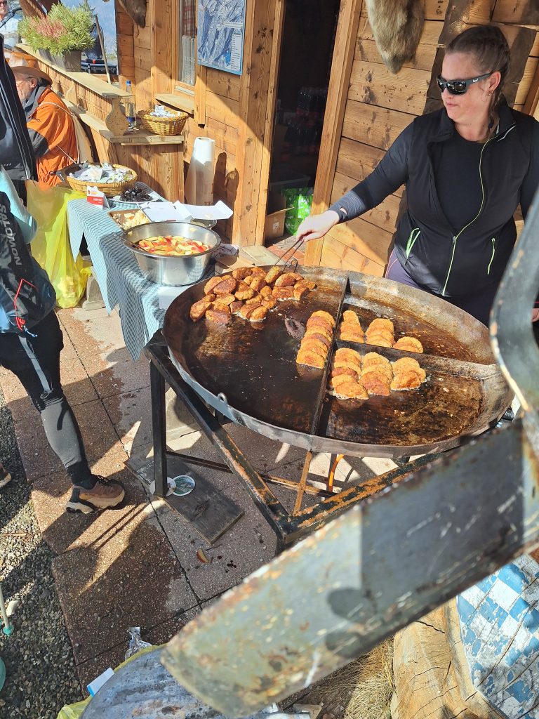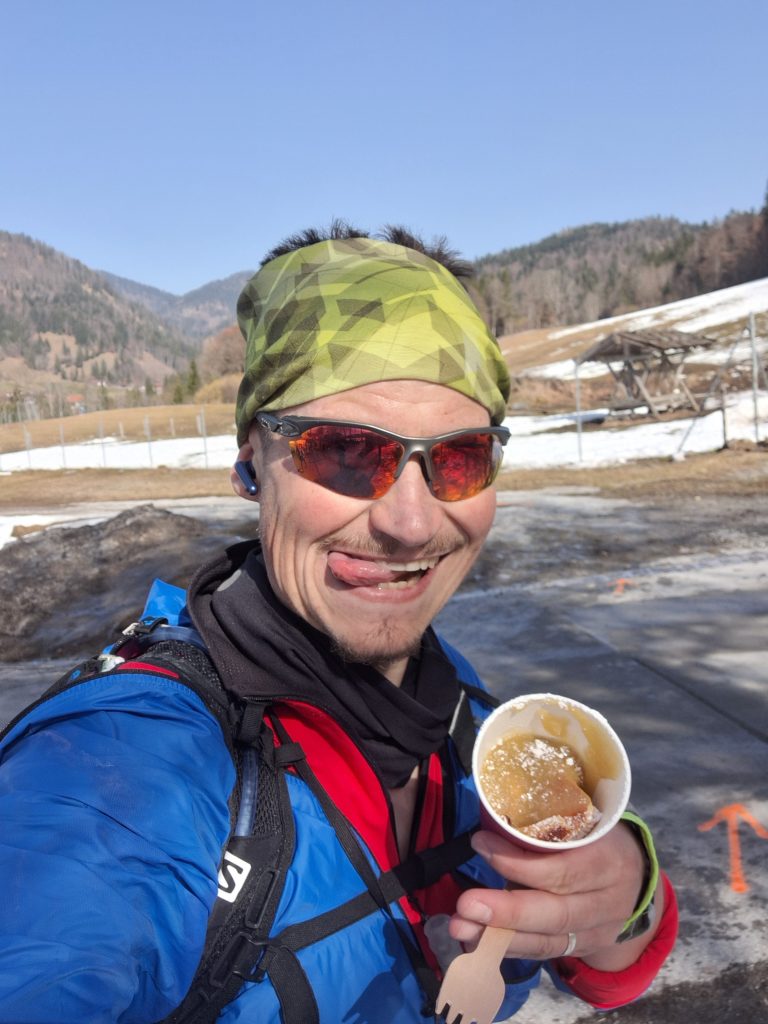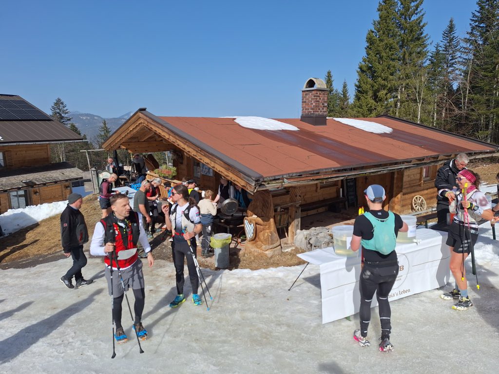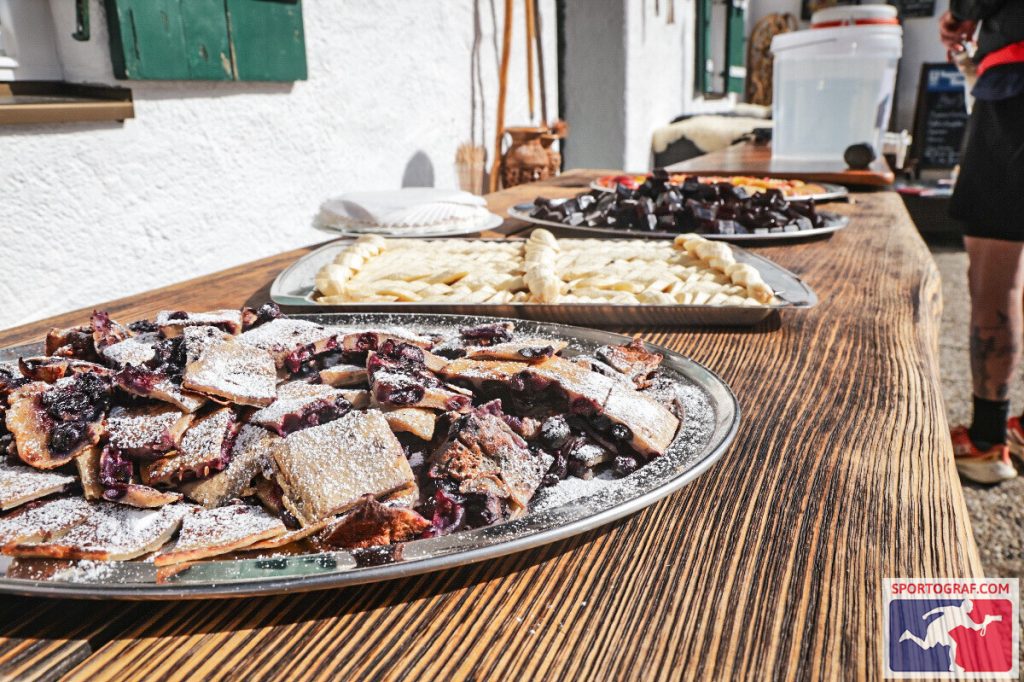 Neben dem Terrain muss ich aber auch über eine zweite Sache schreiben: Die Verpflegung. Außer beim Medoc-Marathon, gab es für mich bisher noch keine bessere. Neben den gängigen Riegeln, Nüssen und Obstschnitzen usw. gab es auch Blaubeer-Pfannkuchen, Kaiserschmarrn, Apfelkuchen und Gemüsepflanzerl. Die Motivation zur nächsten Versorgungsstelle zu kommen war riesig. Zudem gab es diesen Gaumenschmaus auch zumeist an irgendwelchen Berghütten. Ein wunderschönes Ambiente zum Genießen! Die Schwierigkeit lag hier einzig und allein sich nicht zu „überfressen“.
