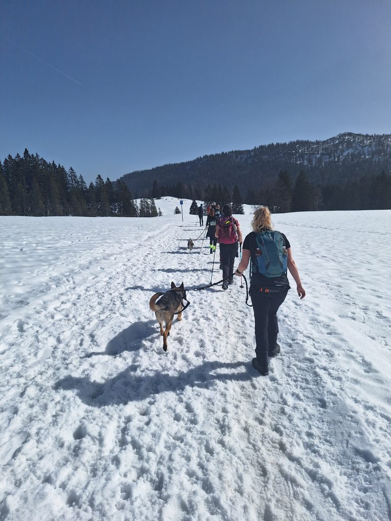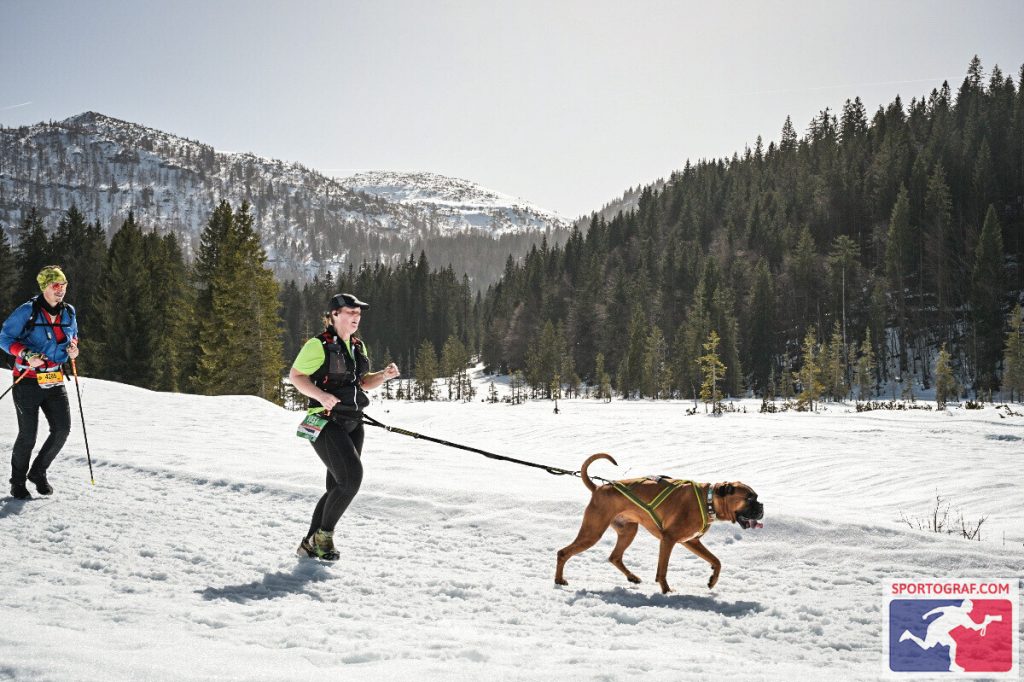 Zurück zum Rennen. Dieses wird in mehrere Streckenlängen unterteilt. Von der einstelligen Kilometerzahl bis zu 42+ gibt es alles. Und dies mal zwei. Warum? Es gibt auch eine Hundekategorie, in der Läufer ihren vierbeinigen Partner mitnehmen können. Doch keine Angst, die Hunde hören sehr sehr gut auf das Wort des Frauchens/Herrchens und sind es allesamt gewohnt, sportlich diese Strecken zu absolvieren. Dies habe ich jedenfalls bei diesem Event so wahrgenommen. Ich musste auch kein einziges Mal angst haben über eine Leine zu stolpern. Die Hunde liefen wie selbstverständlich stets vor ihrem Besitzer. Der Laufweg wurde einem also nie versperrt. Funfact: Wer bei einer Mountainman-Veranstaltung mitmacht sollte genau auf die Art des Riegels achten, denn es gibt auch Proteinriegel für Hunde =) Dem breiten Laufangebot muss allerdings auch etwas Tribut gezollt werden. Im letzten Drittel war die schmale Strecke relativ voll. Man muss sich gut überlegen, wann man den nicht so sulzigen Untergrund verlässt und zum Überholen beschwerliche Schritte durch tieferen Schnee steigt.