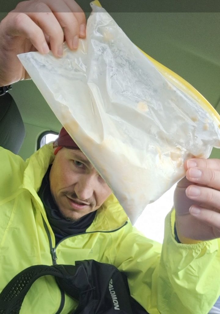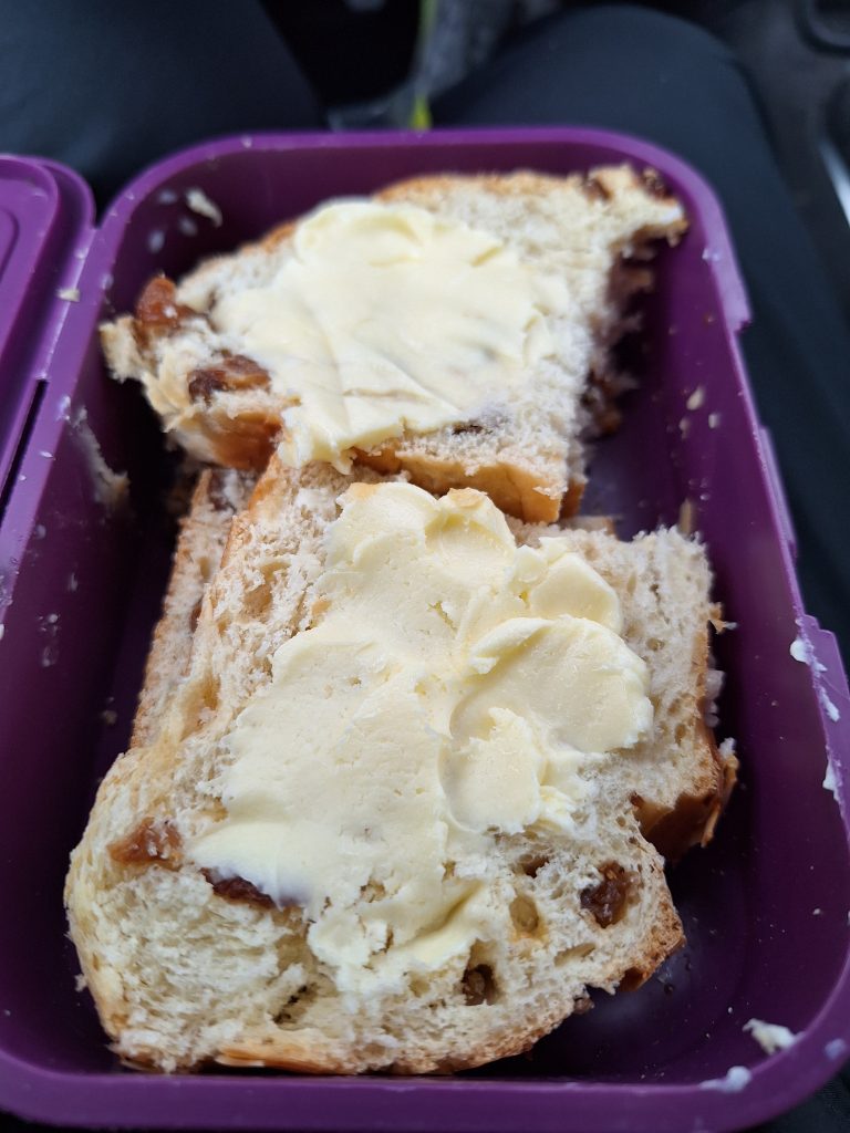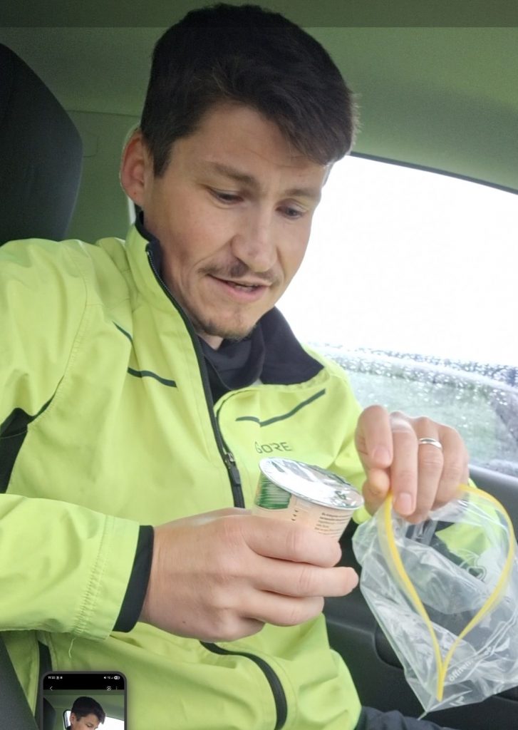 Zufällig wollte ich bei dieser Runde ein kleines Projekt ausprobieren, welches ich im Fernseh gesehen habe. Dabei füllt man Sahne in einen Beutel, steckt diesen in seinen Laufrucksack und läuft. Das „wilde Rumgehopse“ soll die Sahen aufschlagen. Nach ca. 10 km soll es schon fertig sein. Da meine erste Runde 29 km betrug waren die Erfolgsaussichten also recht hoch. Und tadaaaa. Es lief wie geschmiert. Mit Streichzarter Butter konnte ich mir meinen Osterfladen schmecken lassen. Diese Aktion fand ich echt witzig und kann es nur empfehlen einmal nachzumachen.