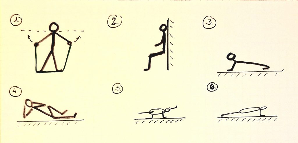 Aus diesen sechs Übungen wähle ich mir pro Einheit immer 3 – 4 aus und tausche durch. Probiert es aus. Ein Effekt lässt nicht lange warten. Ich hoffe, dass ihr mit den Übungen genau so viel Spaß habt wie mit den Zeichnungen. Die waren mir aufgrund der Bildrechte lieber. Falls ihr euch nichts darunter vorstellen könnt, so gebt die Übungen einfach mal ins Netz ein. Ihr werdet sehr schnell fündig werden. Da ich gestern das Workout wieder entfallen lassen musste werde ich mich jetzt auf die Matte legen. Macht es gut.