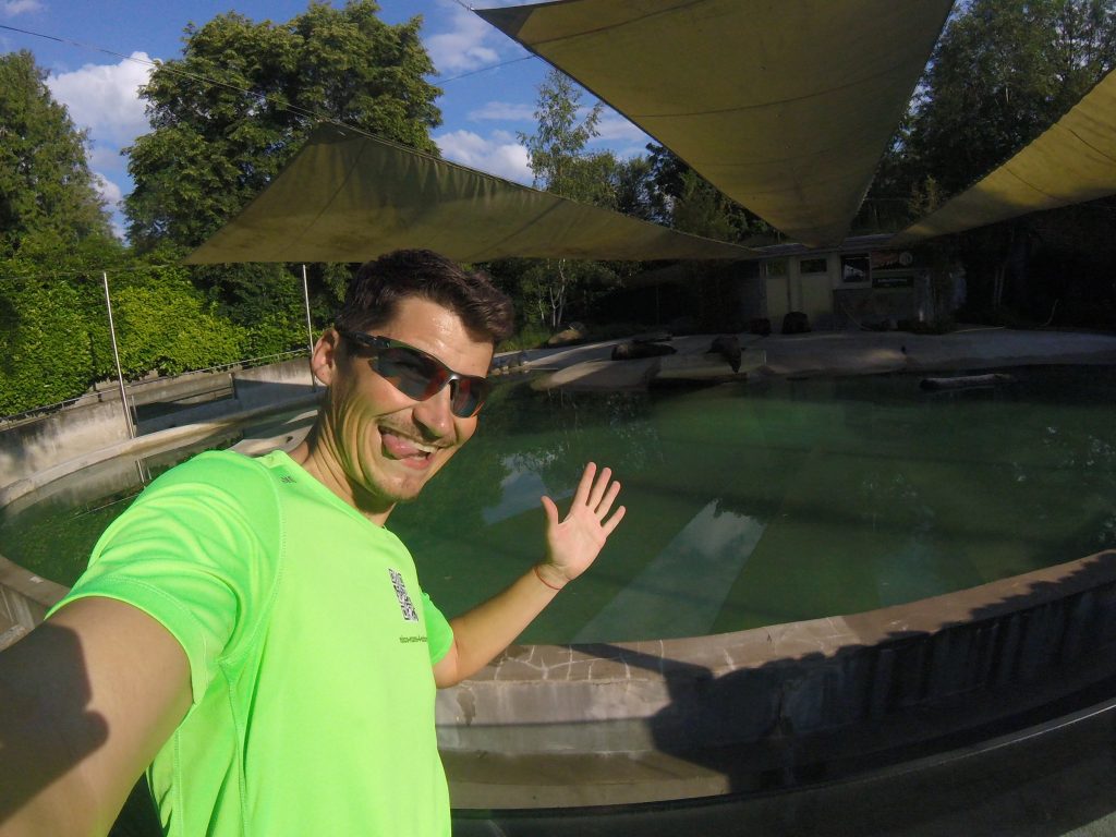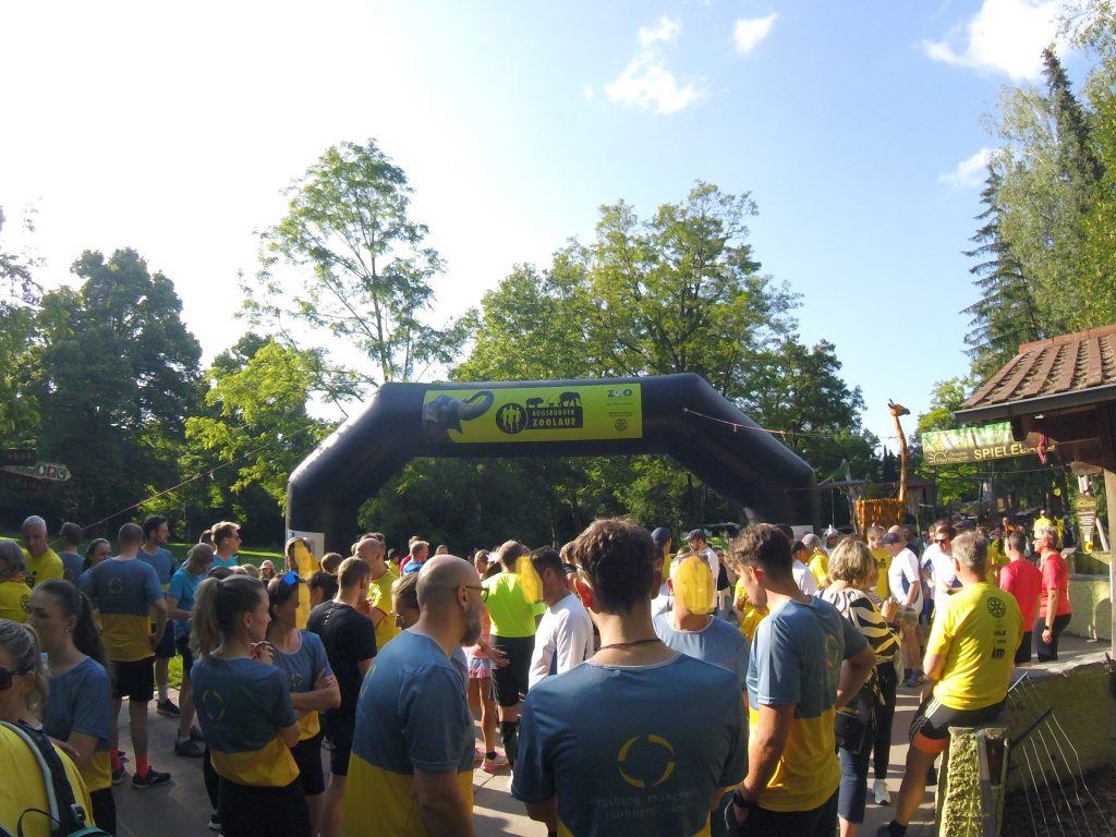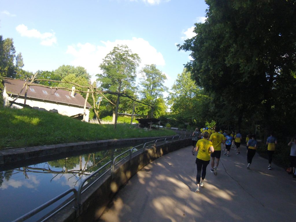 Direkt an der Kinderecke mit Streichelzoo stand dann schon das Start- und Zieltor. Dort machten sich die Athleten und ich bereit den Worten des Moderators zu lauschen und sich das Regelwerk anzuhören. Es galt, so viele Runden wie möglich innerhalb einer Stunde zu sammeln. Nach jeder Runde musste man dabei seine Hand durch einen Gummi fädeln, der bereits fachmännisch von den Helfern aufgespannt wurde. Dies erinnerte unweigerlich an Ritterspiele in Form des Tjostens oder an Eisvögel, die versuchen ein Fisch aufzuspießen. Für jeden Gummi wurde im Nachhinein ein Betrag von 2 € vom Rotary-Club an den Augsburger Zoo gespendet. Dabei kamen zum Schluss 5000 € zusammen. Eine schöne fette Honigwabe für die Zoobären. Doch man sieht auch, dass der Lauf nicht all zu groß war. Dies liegt nicht daran, dass der Lauf keine Fanbase hatte, oh nein. Die Firmen/Läufer stürzten sich bei der Anmeldung wie die Geier auf Aas, so dass die Plätze binnen 24 h bereits vergriffen waren. Woran es lag, dämmerte mir sofort nach dem Startsignal (auf eine Schuss wurde sinnvollerweise wegen der Tiere verzichtet). Die Laufstrecke war natürlich der normale Gästeweg durch den Zoo. An manchen Stellen war dieser sehr schmal. Da ich kein Kletteraffe bin, musste ich mich mit meiner Laufpartnerin fast einen halben Kilometer in Geduld üben, bis sich die Athletenherde auf der Strecke verteilt hatte. Wir konnten in dieser Zeit ganz normal gehen. Diese Meter nutzte ich dann, um mit meiner GoPro auf Safari zu gehen und von den Tieren ein paar Fotos zu machen. Mehr Läufer waren also einfach nicht möglich.